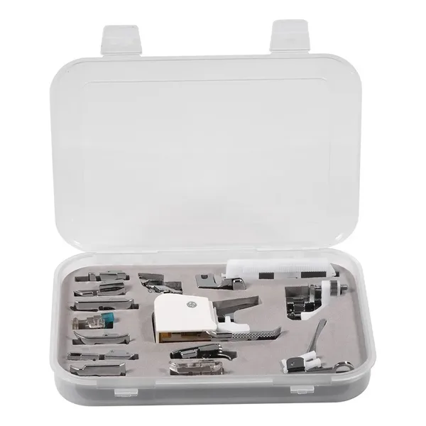 Este prensatelas de costura de 15 piezas/juego puede cumplir con su trabajo de costura ordinario. Tiene un acabado fino y de alta calidad, duradero. Con la caja premium, cada pieza se puede colocar en sus ranuras. Una buena ayuda para el trabajo de costura, práctico y práctico.