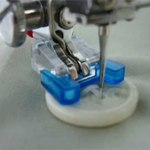 Coser botones será más rápido con este prensatela. Tiene dos barras fijadas en el soporte del prensatela que proporcionan una mayor estabilidad y un manguito de goma, para mantener el botón en su sitio mientras cose.