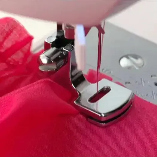 Se puede fruncir una tela; o unir dos telas, frunciendo solo la de abajo (solo para prensatelas con ancho de zigzag de 5mm - como el que se muestra en la foto).